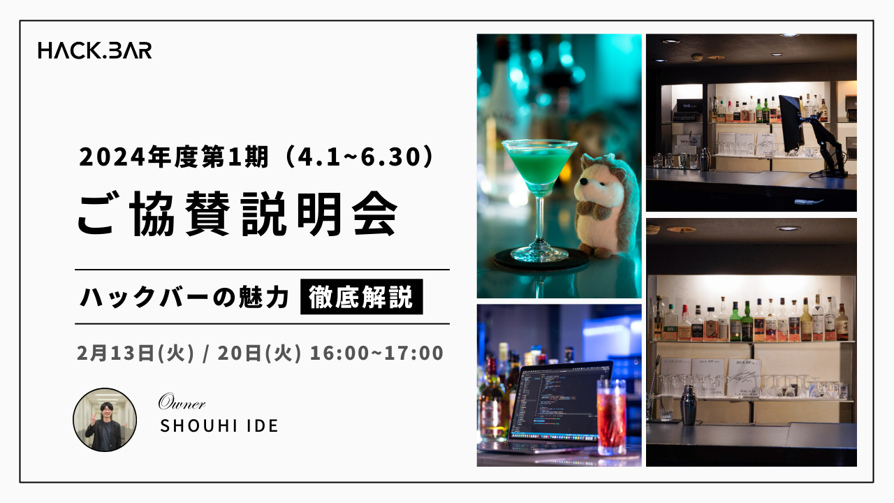 この度、当店エンジニアが集まるバーHACK.BAR(以下:ハックバー)にて2024年度第1期(2024.4.1〜6.30)のスポンサードいただける企業さまの募集を開始したことをご報告いたします。